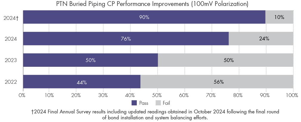 To address these challenges, SI and its CP subcontractor, Bass Engineering, took an iterative approach to system design, installation, and commissioning. This process required multiple design refinements and targeted adjustments to achieve compliance with CP effectiveness criteria while navigating site-specific constraints. The following sections outline the overall CP implementation process and examine key challenges encountered at PTN, along with the solutions developed to address them.