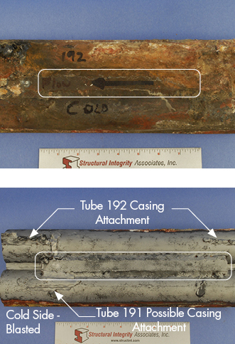 Figure 1 shows the tubes (Tube 191 and Tube 192) in the as-received condition. An annotation by plant personnel notates Tube 192 as the failed tube, although the specific region of failure was not noted. The waterwall tubes are adjoined via membrane weld; however, on the cold side an added “membrane bar” ~10” in length was noted. This “membrane bar” was not fully fused to the tube-to-tube membrane weld, so a gap between the two was present. To facilitate a better examination of the cold side, the tube was grit-blasted to remove the deposits/oxides along the OD surface. Figure 2 shows photographs of the cold side before and after-blasting. A significant number of pad welds, attachment welds, etc. were noted along the cold side OD surface. External or cold side casing attachment points for Tube 192 were confirmed by plant personnel. However, it was unclear if the regions notated for Tube 191 were also attachment points to the casing.