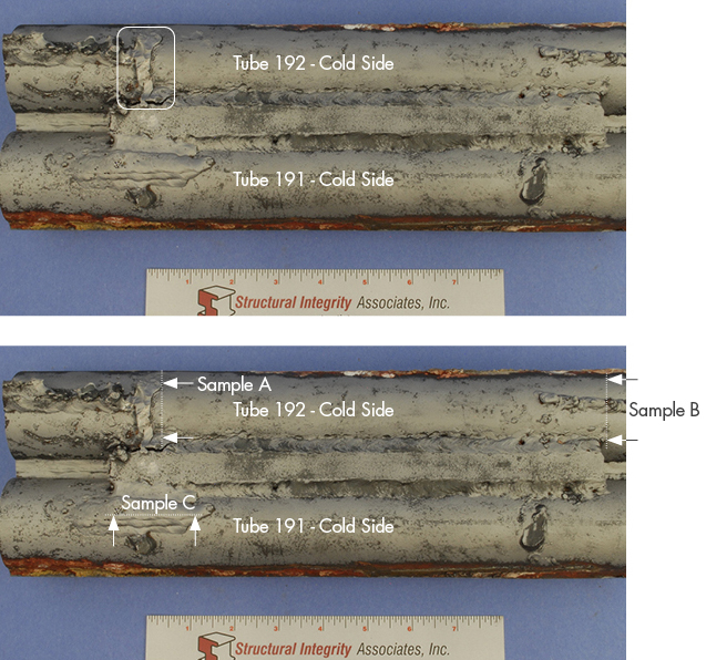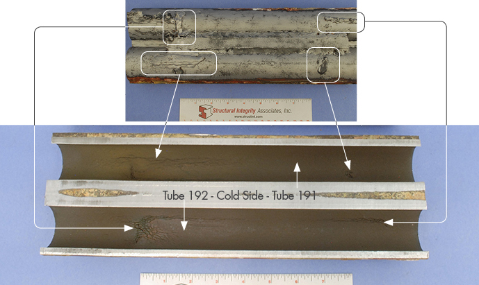 Tube 192 failed as a result of extensive corrosion fatigue (CF) damage on the cold side of the tube that initiated from the ID surface. Each tube exhibited a significant number of pad welds, attachment welds, membranes, etc. scattered along the OD surfaces of the cold side. Along the ID of Tube 192 a multi-array of cracking was noted with a number of parallel cracks oriented in both the longitudinal and circumferential directions and appear directly related to the stress field developed as a result of the welds on the OD surface. Significant cold side damage was also noted for the adjacent tube (Tube 191).