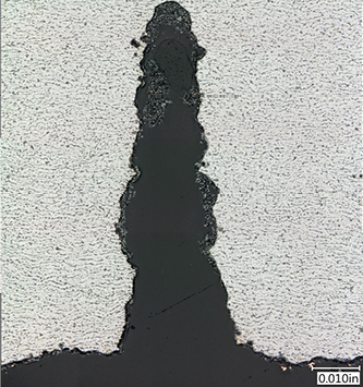 Figure 8 contains an overall stitched photomicrograph of Sample B at the deepest location. This location exhibited typical crack profiles representative of corrosion fatigue with signs of discontinuous growth via corrosion bulges. Minor amounts of copper deposits lined the crack and ID surfaces. At the deepest point, the damage progressed to ~35% of the local wall thickness. These cracks were in line with the added “membrane bar”. A higher magnification photomicrograph of the deepest location from Sample B is shown in Figure 9. The crack is blunt-tipped, contains corrosion bulges, and is lined with deposits/oxides.