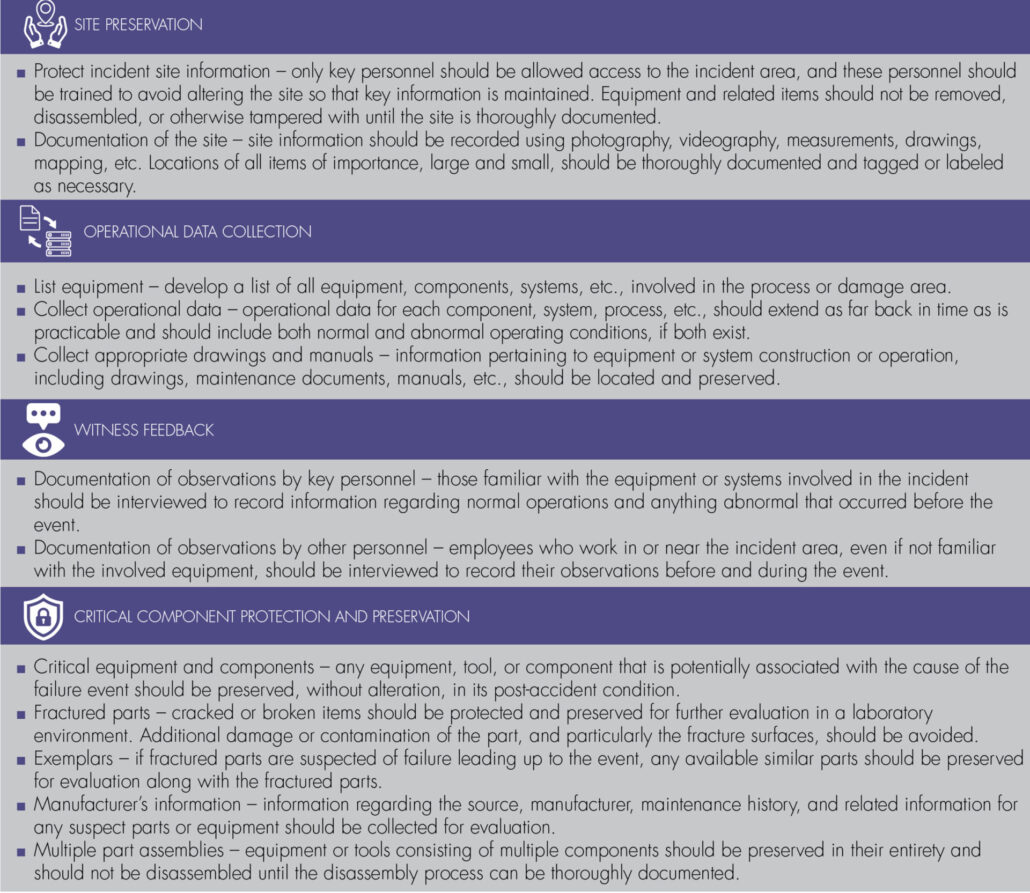 After safety procedures have been implemented, and the chance for additional injury or damage has been eliminated, the investigation process can begin. Regardless of whether the investigation process is handled by internal personnel, federal or state investigators, insurance representatives, independent consultants, or some combination of the above, the preservation of information and evidence is critical. An additional consideration is the potential for legal disputes that might stem from the event, and in some instances, investigators may be working under the direction of attorneys who are trying to protect and preserve this critical evidence.
