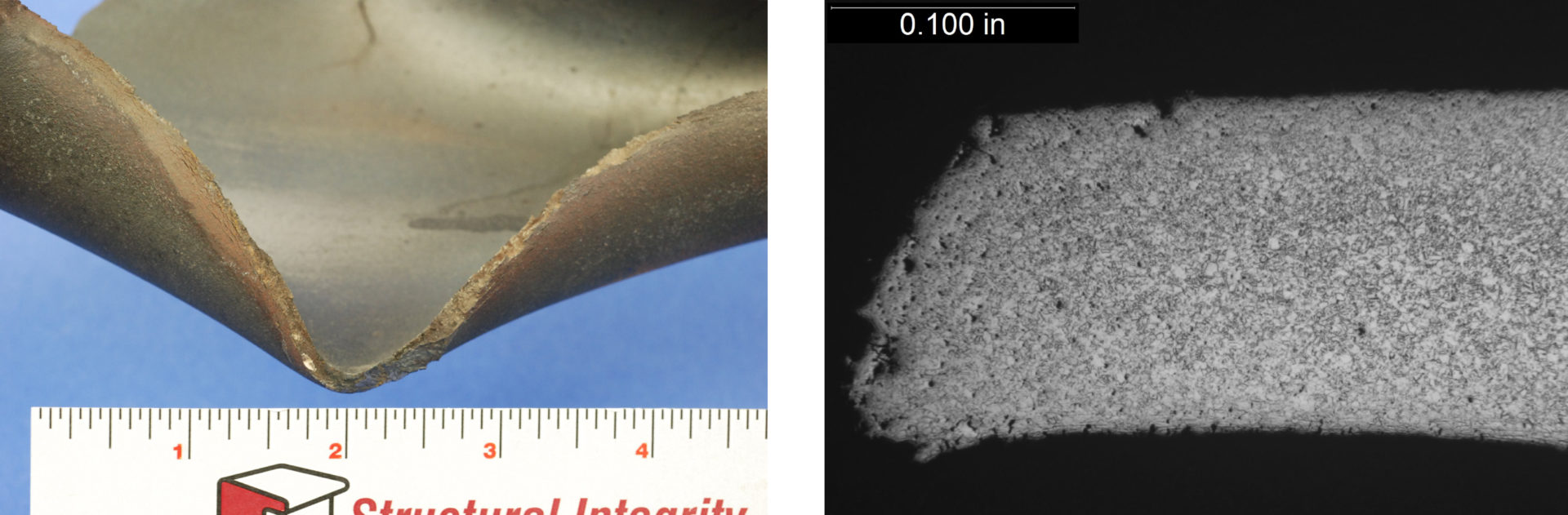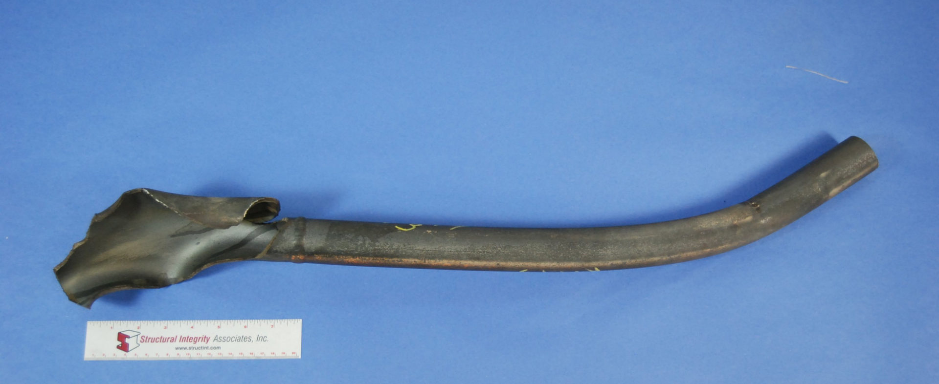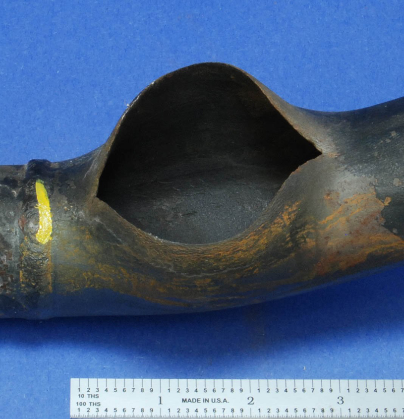 The mechanism of failure for short-term overheating involves a relatively rapid increase in metal temperature due to the partial or complete interruption of flow through the tube of the cooling fluid.  In response to the temperature increase, the strength of the material drops and under the influence of the internal pressure the tube begins to swell.   Depending on the maximum temperature reached during the overheating incident, failure can occur in a matter of minutes and will appear as a fish-mouth type rupture oriented parallel to the axis of the tube.  Typically the material ductility will increase with the temperature, so that the final rupture will be thin-lipped with substantial swelling evident in the overheated area.  However where the maximum temperature of exposure exceeds the upper transformation temperature some heats of material will experience a drop in ductility, in which case the rupture edges may show only a moderate degree of thinning and swelling may be more limited.  In such cases, the metallurgical examination of the failure will confirm the fact that the temperature had exceeded the upper critical transformation temperature immediately prior to the failure.  Depending on the nature of the blockage, the period of intense overheating that triggers the short-term overheating failure can be preceded by a longer period of moderate overheating in which partial blockage of steam flow causes an intermediate rise in metal temperature leading to damage that is more typical of a long-term overheating condition.