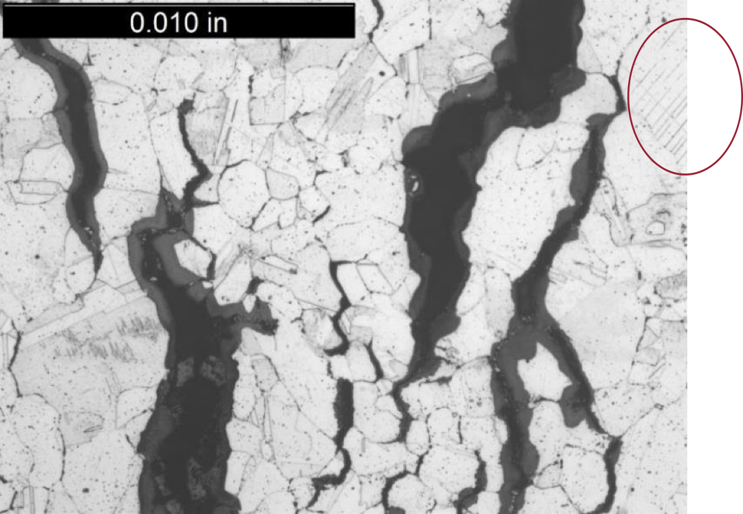 Regardless of when the precipitation occurs, once it has occurred and the interior of the grains have been strengthened and the grain boundary regions have been weakened, then any strain that is imposed on the material in response to an applied or residual stress is forced to concentrate in the grain boundary region, which serves to substantially magnify the strain’s effect. For example, in a situation where the bulk strain experienced by a segment of a cold-worked stainless superheater tube might be very small – a fraction of a percent – if the material has undergone the SIPH reaction, then the strengthened grain interiors will undergo no strain, while within the much smaller volume of the comparatively weak grain boundaries the accumulated strain will be orders of magnitude higher than the bulk level.