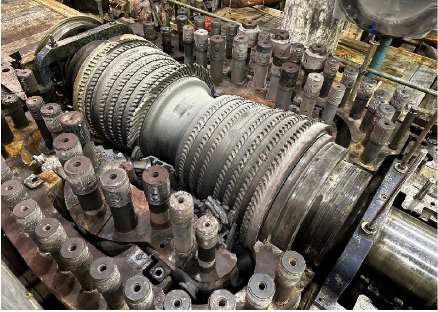 Initial investigation indicated severe damage to the HP, IP, and LP turbines (refer to rotor cross section in Figure 1). External observations of the STG indicated damage to piping and bearings along the drivetrain. The HP bearings and IP rear bearing were found heavily damaged with the bearing caps and coupling guards knocked off. The LP1 rear bearing was also identified to have coupling guard and bearing cap damage. The LP2 rear bearing and exciter showed damage to a lesser degree. Insulation damage was observed throughout the HP, IP, and LP crossover piping, along with damage to piping hangers and instrumentation.
